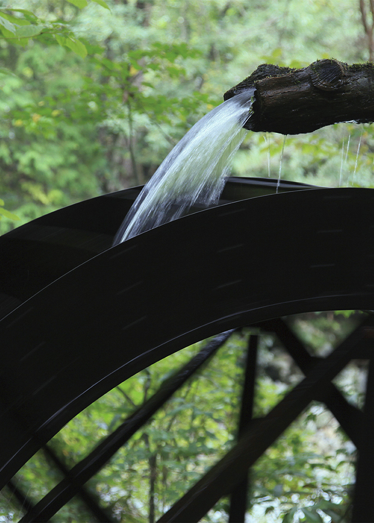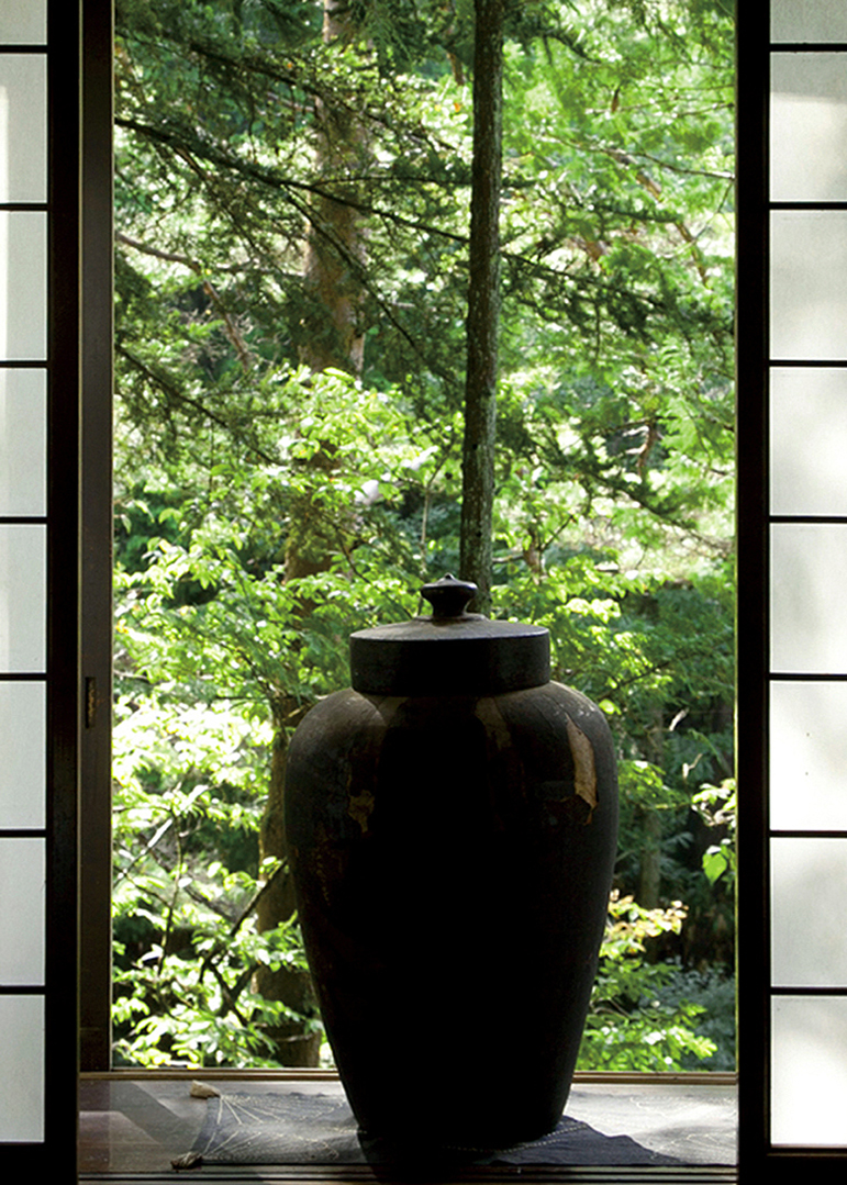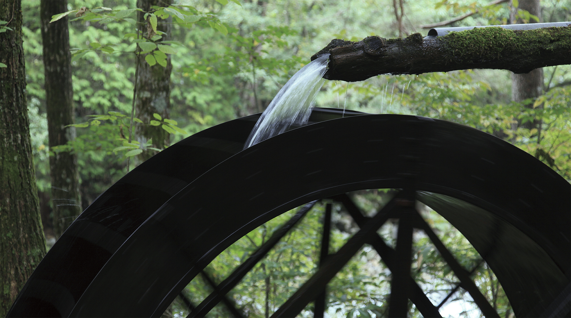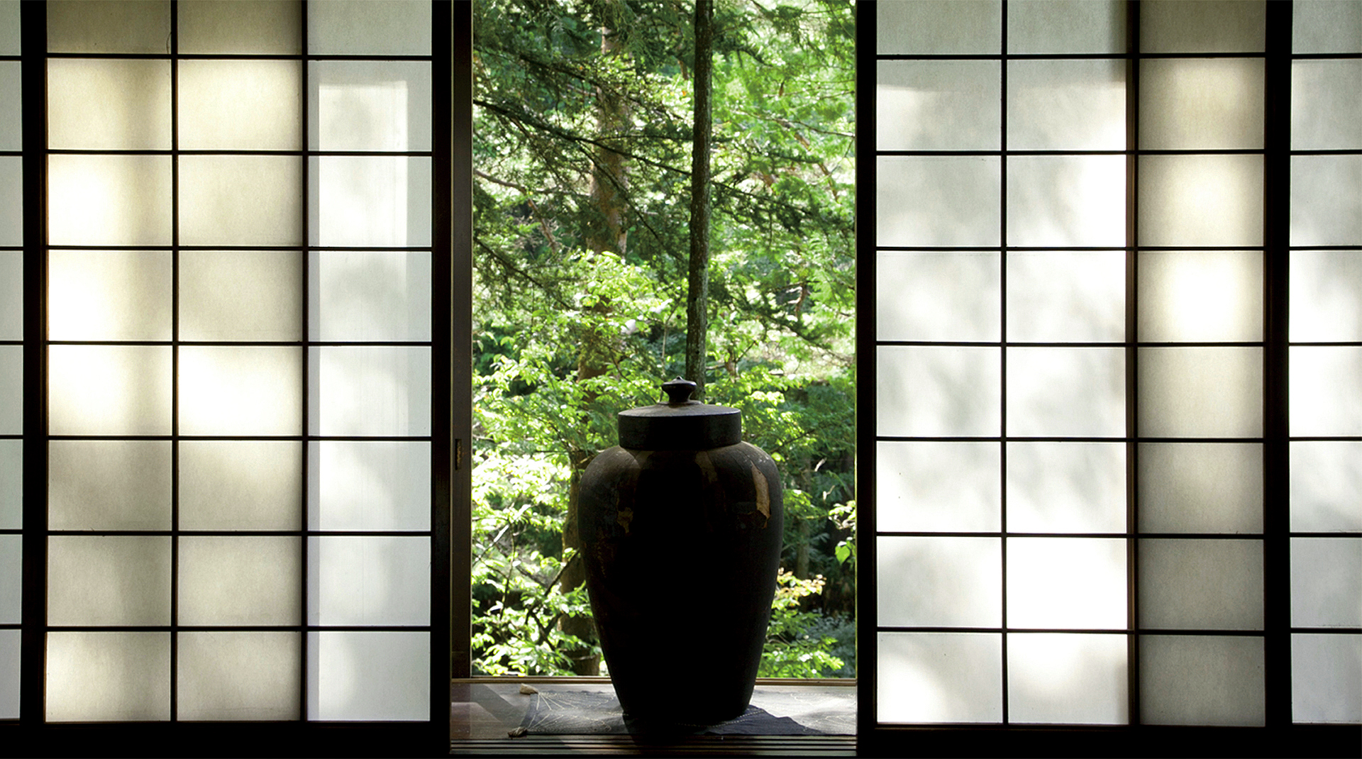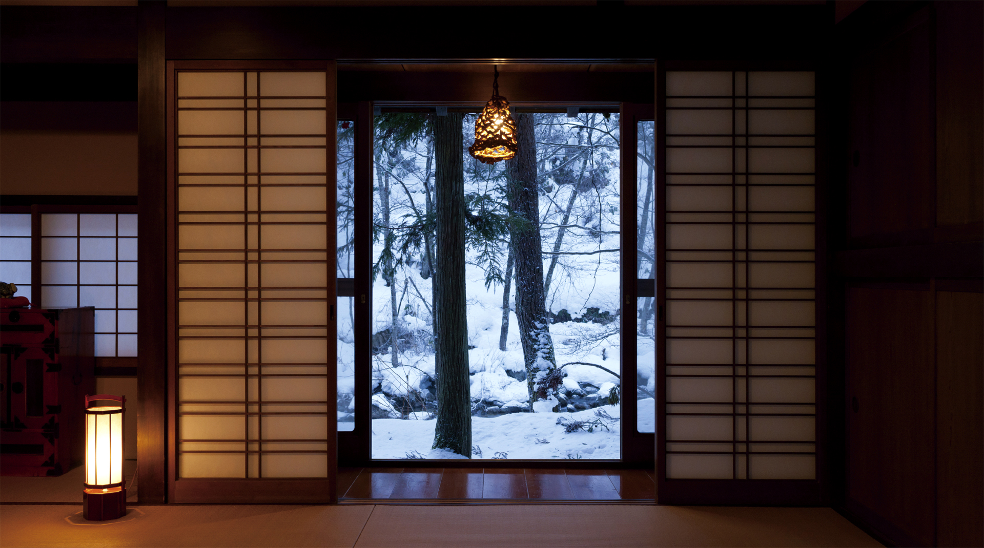 一枚のガラスの窓からは飛騨の大自然がまるで一幅の絵画のように、庭園内を流れる